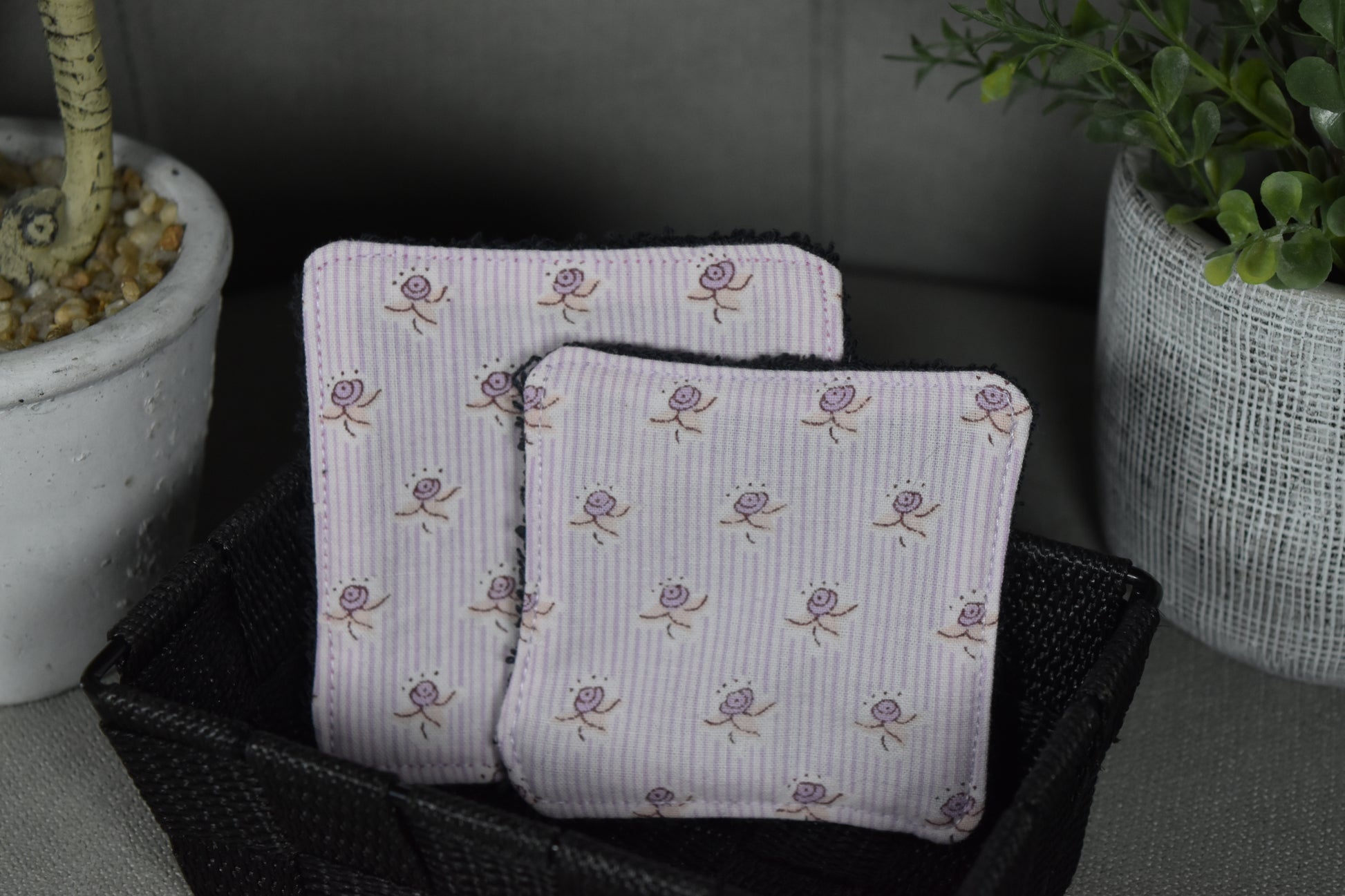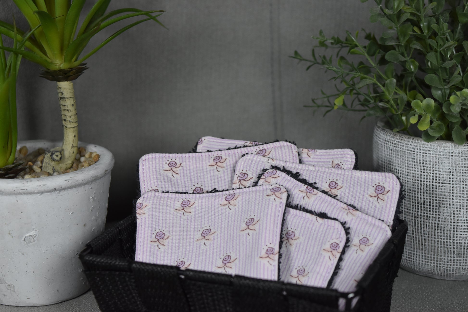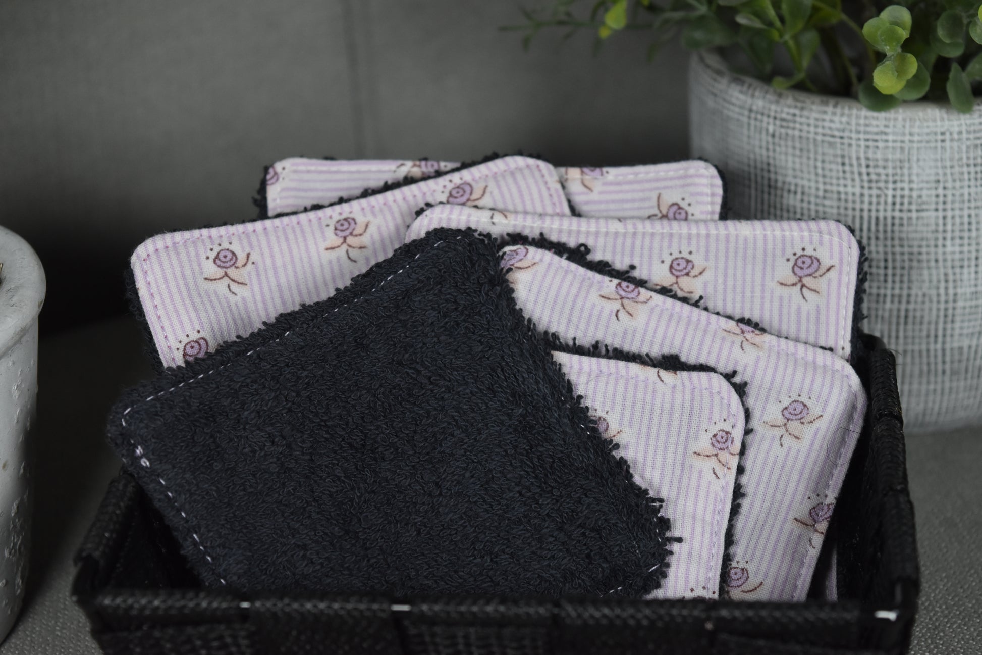 Gardez votre routine beauté éco-responsable avec notre set de cotons démaquillants lavables. Fabriqués en tissu éponge noir et tissu rose à fleur 100 % coton recyclé, ces 5 cotons doux et réutilisables sont un choix durable et pratique pour votre peau et l'environnement. Se lave facilement à la main ou à 30°C pour une utilisation quotidienne.